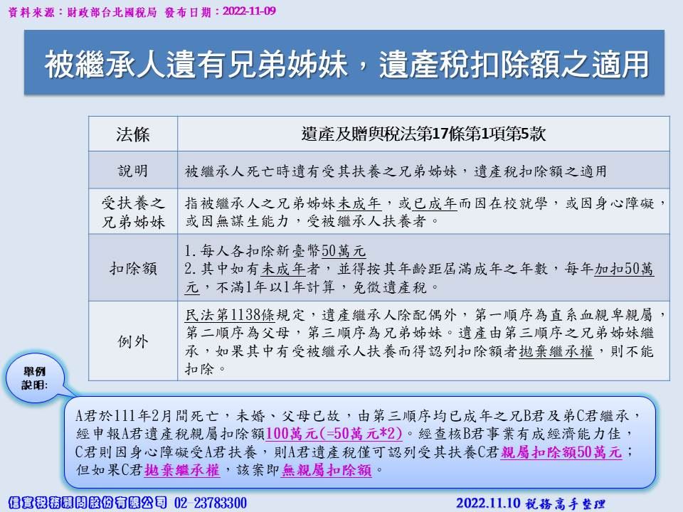 今天要來複習遺產稅法中,有關被繼承人過世後遺有其受扶養之兄弟姊妹,可自遺產總額中每人各扣除新臺幣50萬元,其中如有未成年者,並得按其年齡距屆滿成年之年數,每年加扣50萬元,不滿1年以1年計算,免徵遺產稅。