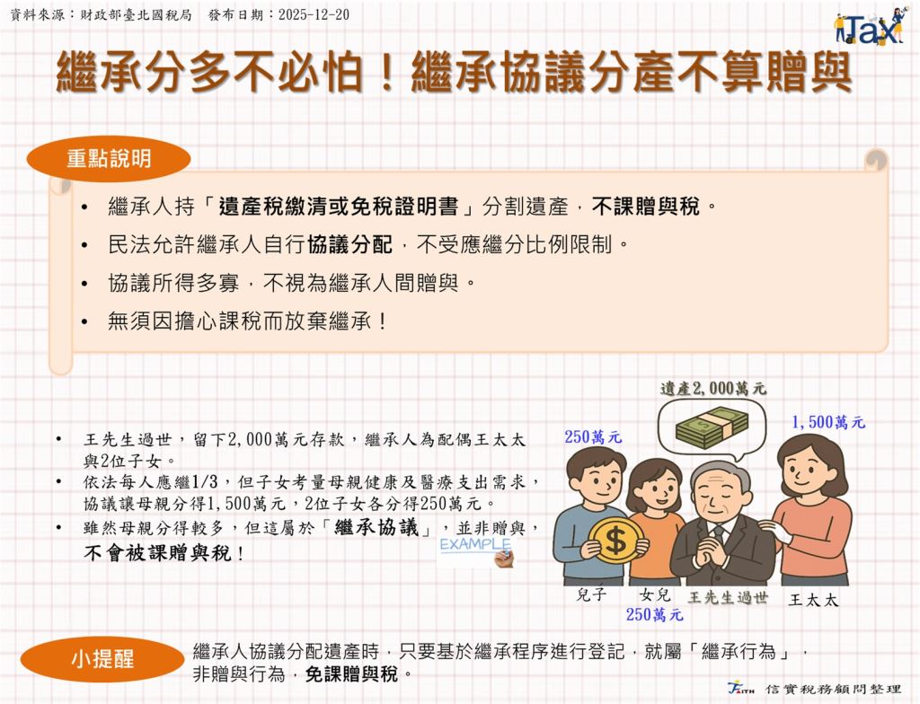 只要是繼承人依法繼承後的協議分割,不論分多分少,皆屬遺產分配行為,不產生贈與稅問題,不會被課贈與稅喔。