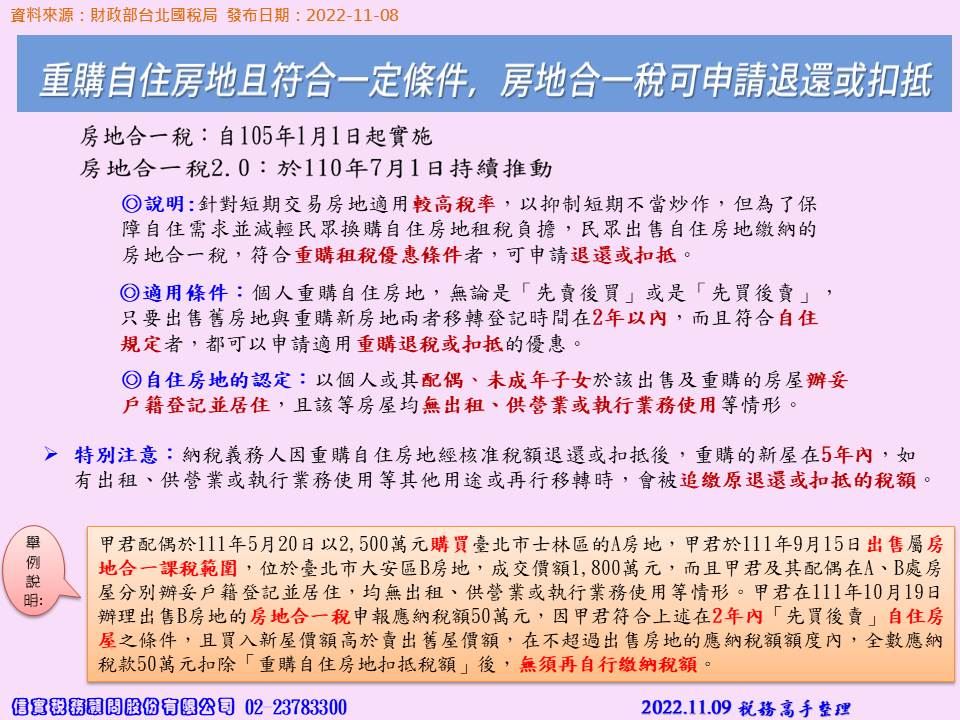 ◎說明:針對短期交易房地適用較高稅率,以抑制短期不當炒作,但為了保障自住需求並減輕民眾換購自住房地租稅負擔,民眾出售自住房地繳納的房地合一稅,符合 #重購租稅優惠條件 者,可申請退還或扣抵。