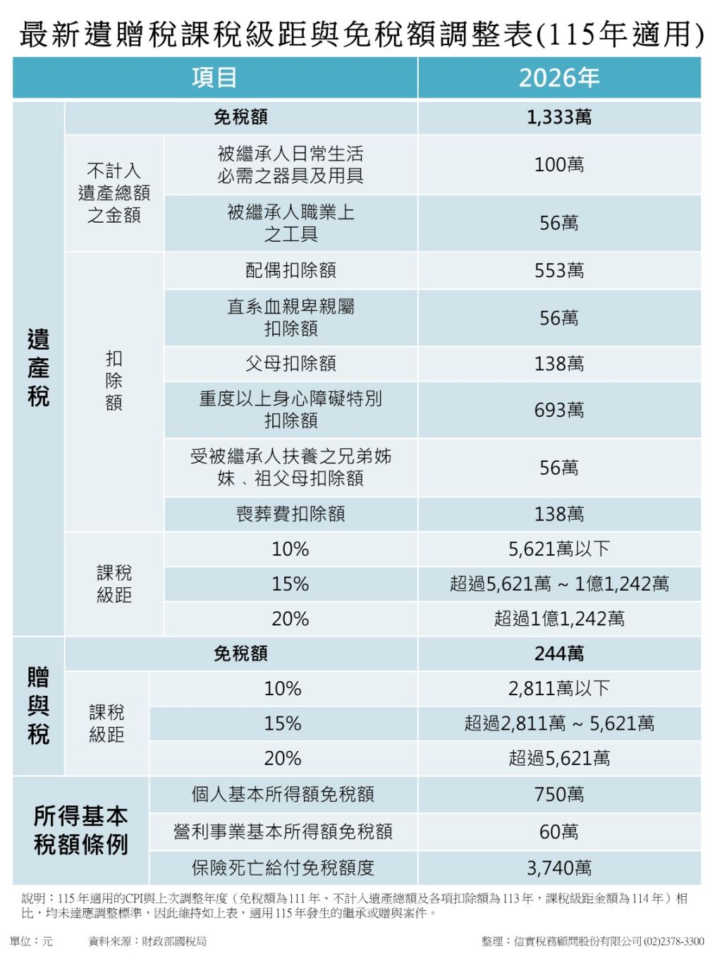 2026年新版遺贈稅暨綜所稅稅率表