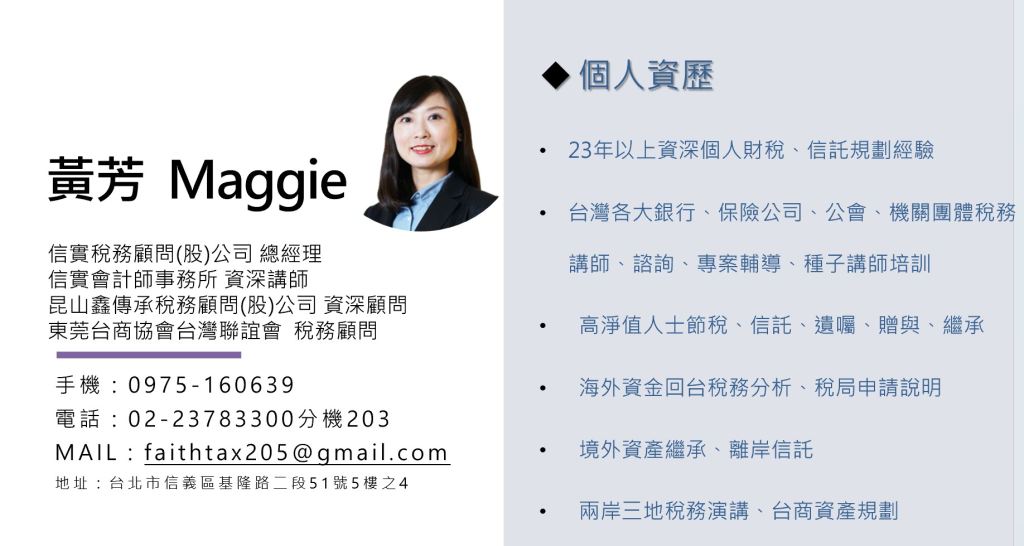 黃芳老師 現任信實稅務顧問(股)公司總經理,並擔任信實稅務顧問(股)公司專任資深財稅與信託講師,擁有超過23年的財稅實務經驗,同時也是信實會計師事務所專任財稅講師。