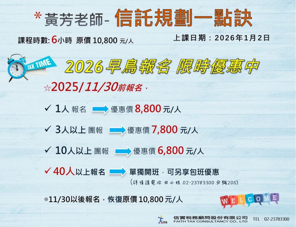 【2026開春強檔課程】黃芳老師 : 信託規劃一點訣 (1/2日開課)