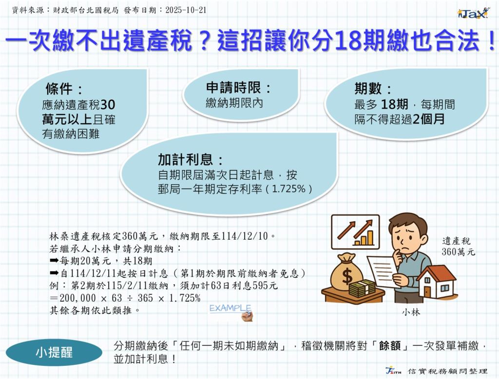 一次繳不出遺產稅?這招讓你分18期繳也合法!