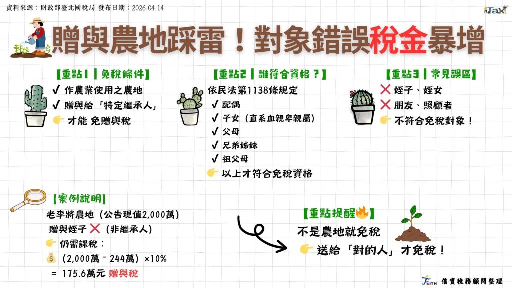 然而,若贈與對象不屬於上述範圍,即使土地符合農業使用,也無法適用免稅規定。